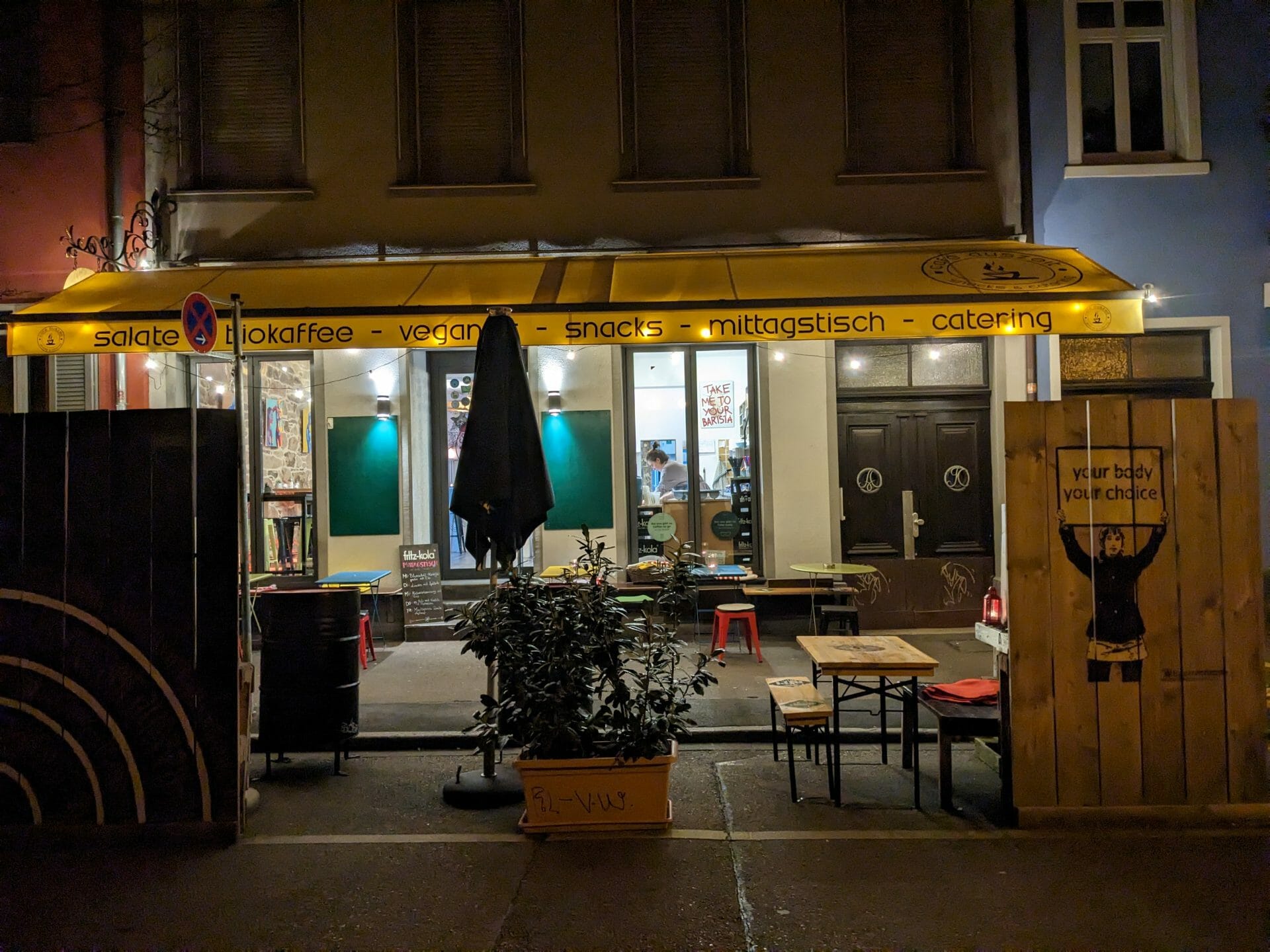 ab 6 Uhr gibt’s hier nen leckeren Kaffee für dich – was knusprig frisches zu Essen oder veganen Früchtejoghurt – sogar den Salat im Glas für zur Arbeit – und natürlich den unzensierten Morgen Talk der Freiburger Frühaufsteher Szene 😉